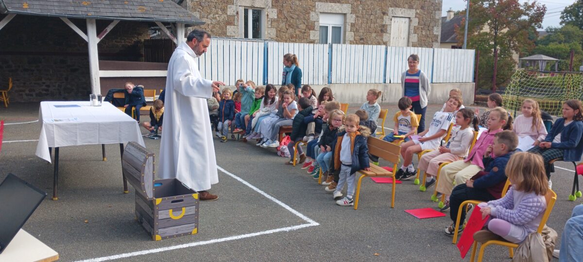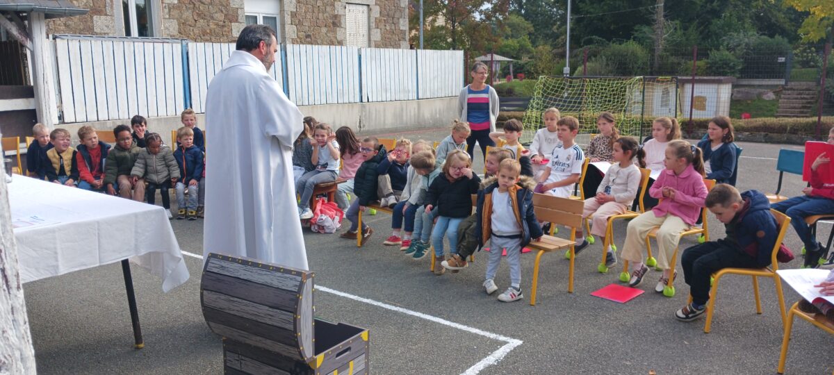 Le Père Guillaume de Montgolfier est venu célébrer la rentrée dans notre cour de récréation. Un temps fort sur le thème du “Trésor”, représenté par chaque classe.